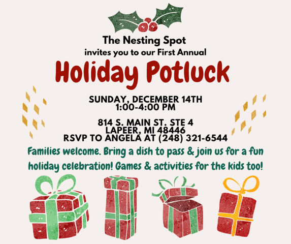Home About Us Services Contact Us Events Events REGISTER HERE The Nesting Spot, LLC Location 814 S. Main St Suite 4 Lapeer, MI 48446 FollowFollow Contact (248) 321-6544 hello@thenestingspotllc.com CONTACT US Professional associations Copyright © 2025 The Nesting Spot, LLC. All Rights Reserved. Photos courtesy of Sarah Stepaniak Photography.
